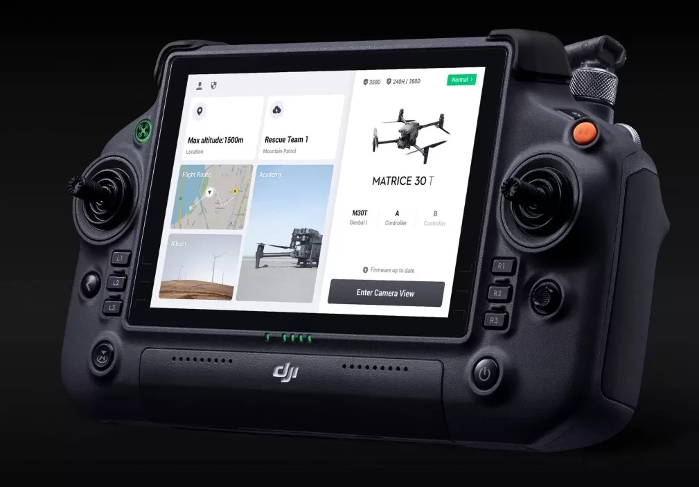 The DJI RC Plus is a robust industrial controller with a large, bright display.