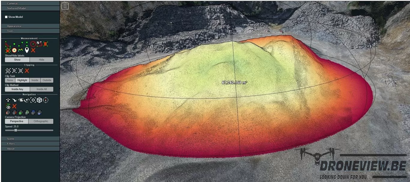 Important note on demo models: Since GPS coordinates and geographical metadata have been removed from these specific demos (to protect privacy), the software lacks a real-world reference frame. As a result, the displayed measurements and volumes in these public examples are not representative of the actual dimensions. In an official Droneview.be project using GPS data and Ground Control Points, these measurements are, of course, accurate to the centimeter.